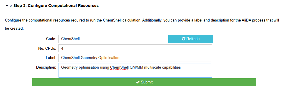 This wizard exposes fields which allow the user to configure which AiiDA code instance the workflow will use to carry out the jobs, this includes fields to specify computational resources to provide to the code instance such as memory and MPI processes (for parallel codes). These can often be set to sensible defaults so the user doesn’t need to understand how they work internally. Finally this wizard also exposes input fields to provide a label and description which will be applied to the submitted AiiDA process node. As this is the final input based step once the submit button is pressed the model side of the app will collate the input variables provided and submit the process.